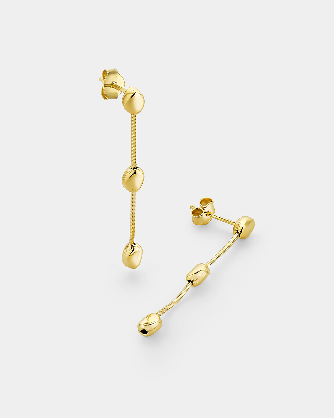 Linear earrings with gold-plated discs. Sleek, versatile, and effortlessly modern, VOGUE.