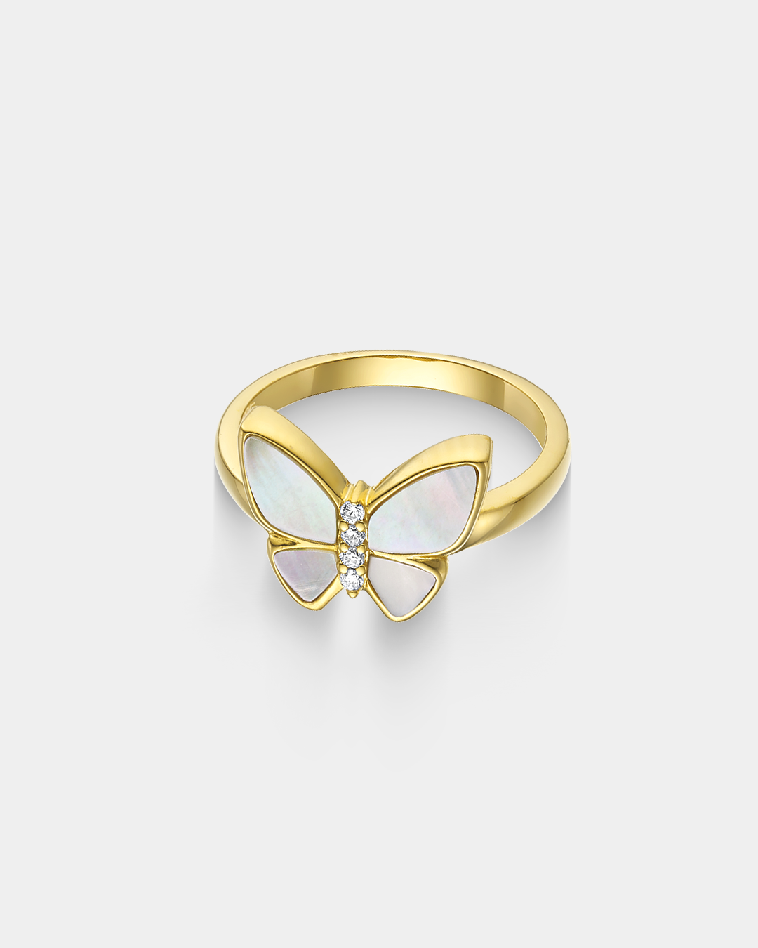 Δαχτυλίδι πεταλούδα με λευκό φίλντισι που αιχμαλωτίζει το φως από κάθε γωνία. Ιδανικό για ένα φρέσκο statement, VOGUE.