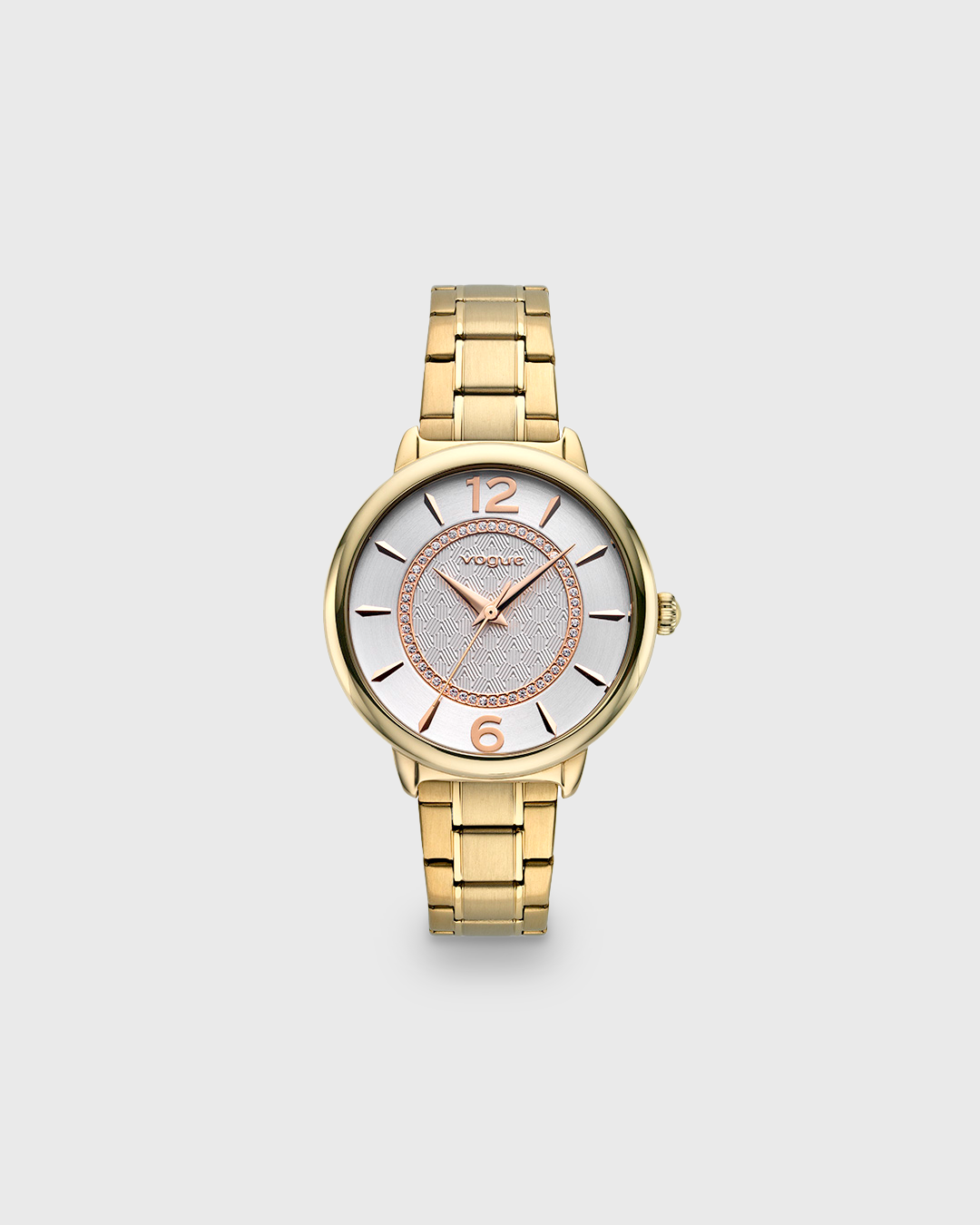Γυναικείο ρολόι από τη σειρά Lucy, με ασημί χρώμα καντράν το οποίο εκτείνεται σε δύο τμήματα χωρισμένα από στεφάνι με λευκά nano ζιργκόν. Στο πρώτο τμήμα οι δύο κεντρικές ενδείξεις τις ώρας αναγράφονται με αριθμούς, ενώ παράλληλα στο κέντρο του απεικονίζεται ένα ιδιαίτερο σχέδιο χάραξης. Αυτό το όμορφο ρολόι έρχεται να συμπληρώσει ατσάλινη κάσα και μπρασελέ κλασσικού σχεδίου σε κίτρινη χρυσή επιμετάλλωση 18 καρατιών, VOGUE.
